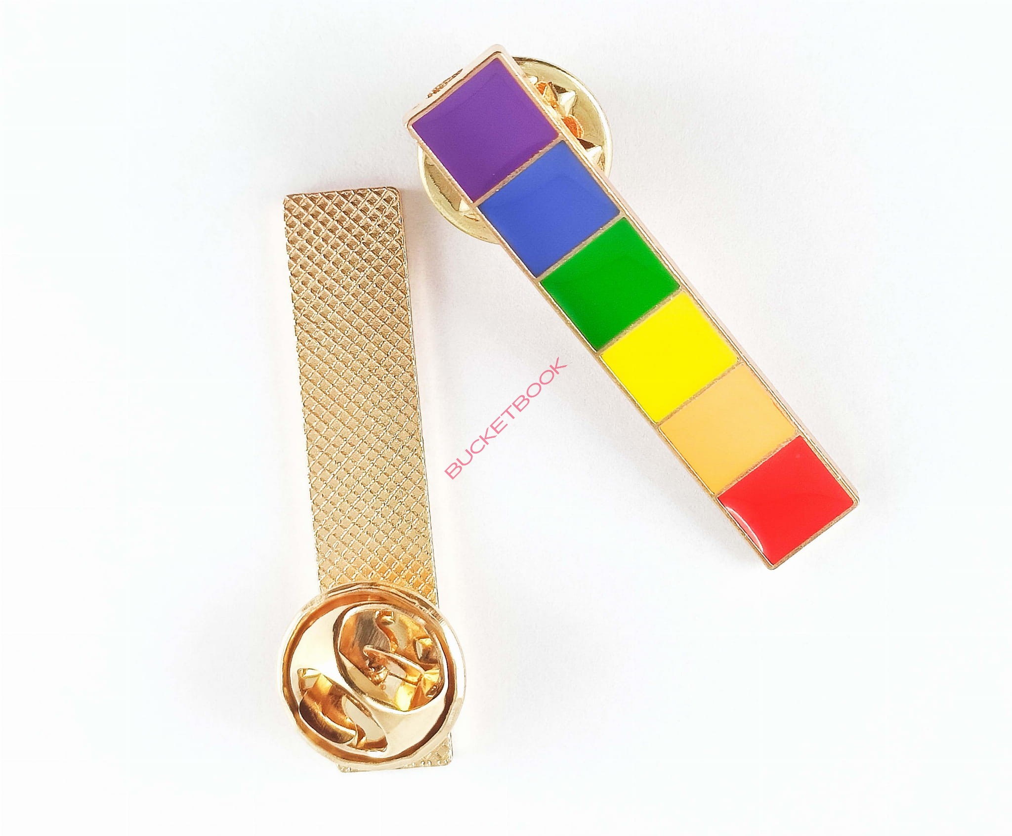 Queerowa przypinka, pin, wykonana z metalu i kolorowej emalii.