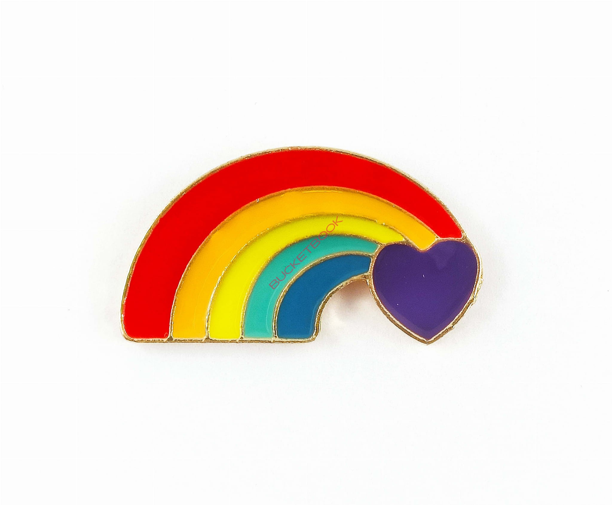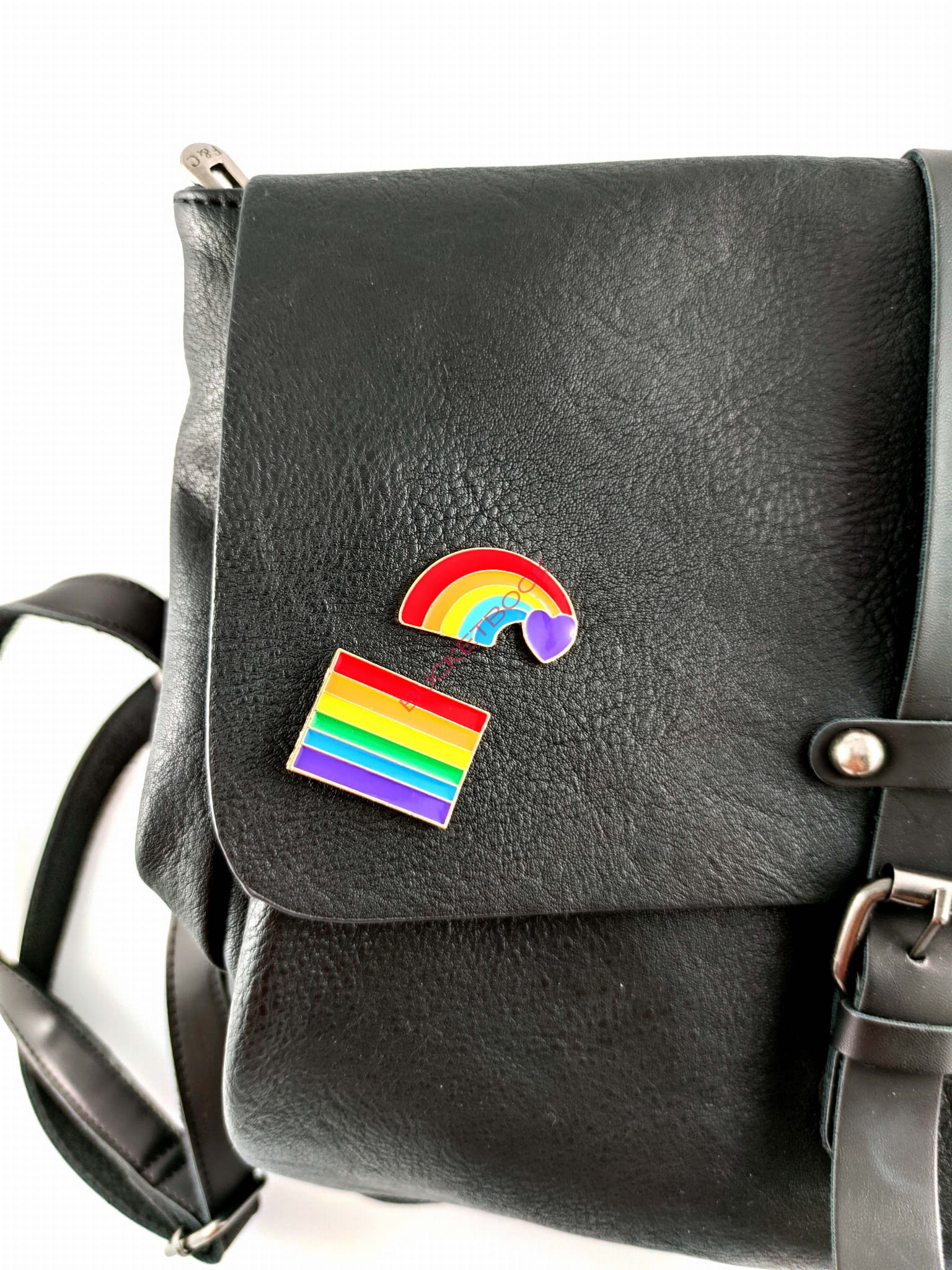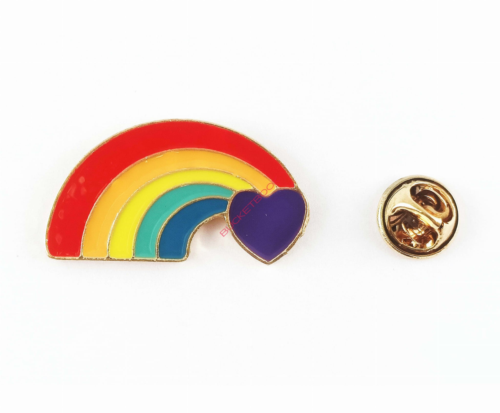 Tęczowa przypinka, pin, wykonana z metalu i kolorowej emalii. Zapięcie na metalowy motylek zaciskowy.